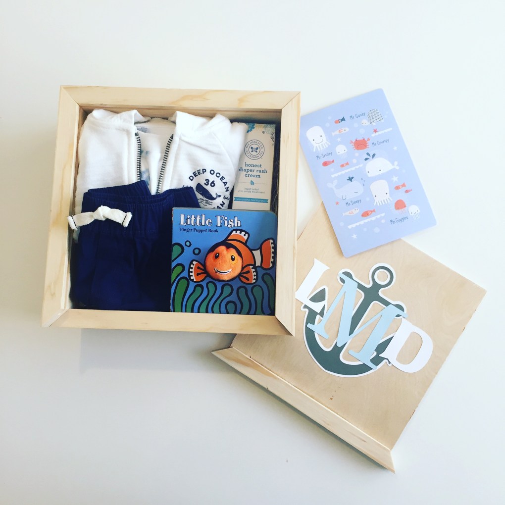 Ahoy, baby boy!  There’s nothing better than the sweet smell of a newborn baby.  Well, except maybe helping to celebrate the new little’s arrival perhaps.  We were excited to put together a custom gift box to welcome a couple’s first tiny #SuiteHeart and since it was a boy and his daddy used to be a lifeguard and his grandfather was in the Navy, what better theme than a nautical one to make celebratory waves for little Logan?