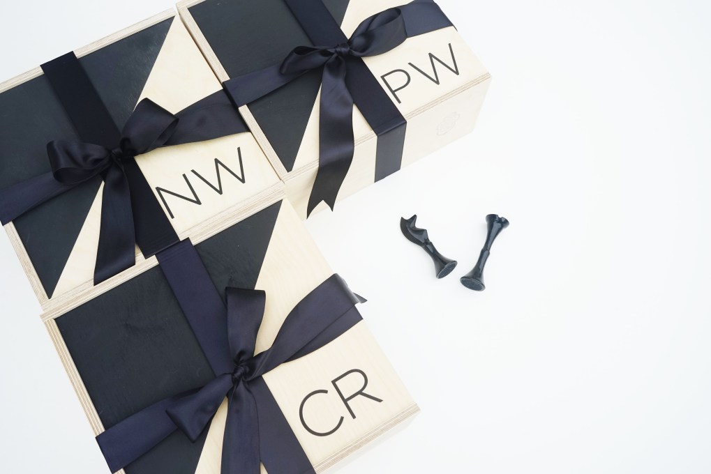 We then hand painted the wooden box lids matte black on the diagonal as a modern way to dial up the masculinity. Then each groomsmen had their initials painted on top for an additional layer of customization. A sleek black ribbon finished off the handmade boxes and alluded to the color scheme inside. These by far are our favorite boxes that we’ve curated to date!