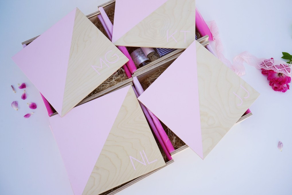 For the bridesmaids and wedding planner, we started with a feminine blush palette and hand painted the lids in a subtle pink hue. The initials on the outside of the box for each of the girls mirrored the customization we did for the groomsmen. For texture and added femininity, we tied the gifts in a rustic rose-colored lace.