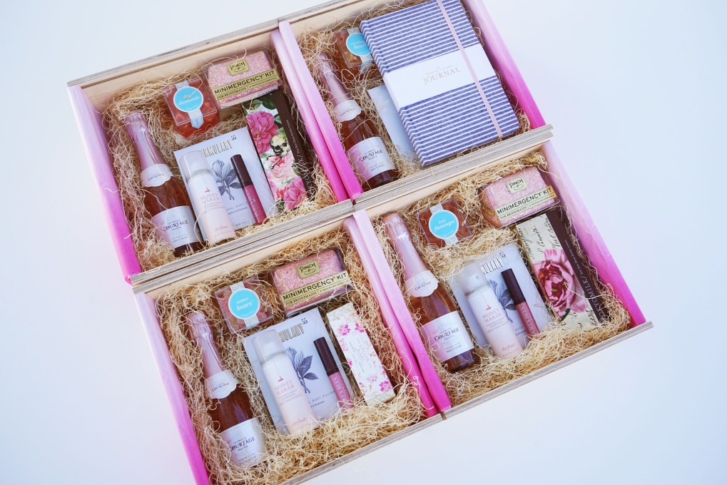 Under the lid was pretty pink ombré tissue secured with a gold foil “thank you” sticker. Inside we included a petite bottle of rosé to help celebrate the beautiful bride on her big day and a glittery bridesmaid “minimergency” kit filled with 21 little essentials like double-sided tape, clear nail polish, hair elastics, safety pins, and extra wedding bands just in case anything went awry during the ceremony. (Spoiler: everything turned out ok.)