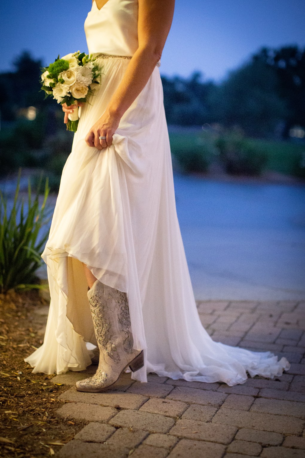 Jim was even on hand to greet guests as they arrived at the wedding – complete with a customized treat bucket! (Umm, I totally want a horse greeting guests at my wedding now too.) I mean if that idea doesn’t completely embody Lauren and her fun loving personality, then the crystal covered cowboy boots she wore under her breathtaking and flowy BHLDN wedding dress should.