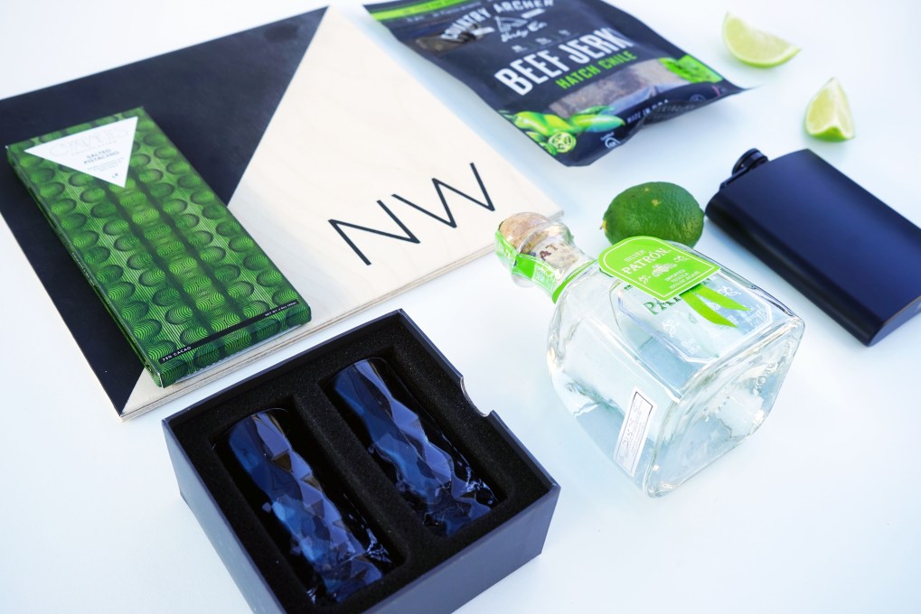 Lauren’s husband, Mike, had a clear vision for the gifts he’d be giving his buddies standing next to him on his wedding day. He was steadfast that the gift boxes include a bottle of their favorite spirit: Patron Silver. We knew that the bottle might get opened right there on the spot at the wedding, so we also made sure to include a pair of high-end crystal shot glasses and a fresh lime to go with it.