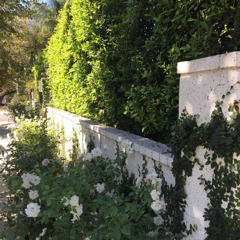 To soften the hardscape, we’ll add a row of white iceberg roses in front of the wall. This will break up the space between the sidewalk and the wall with pretty foliage that echoes the already existing white roses in the brick planters and along the parkway. We’ll also plant some fig vine that will eventually climb up the half wall too.
