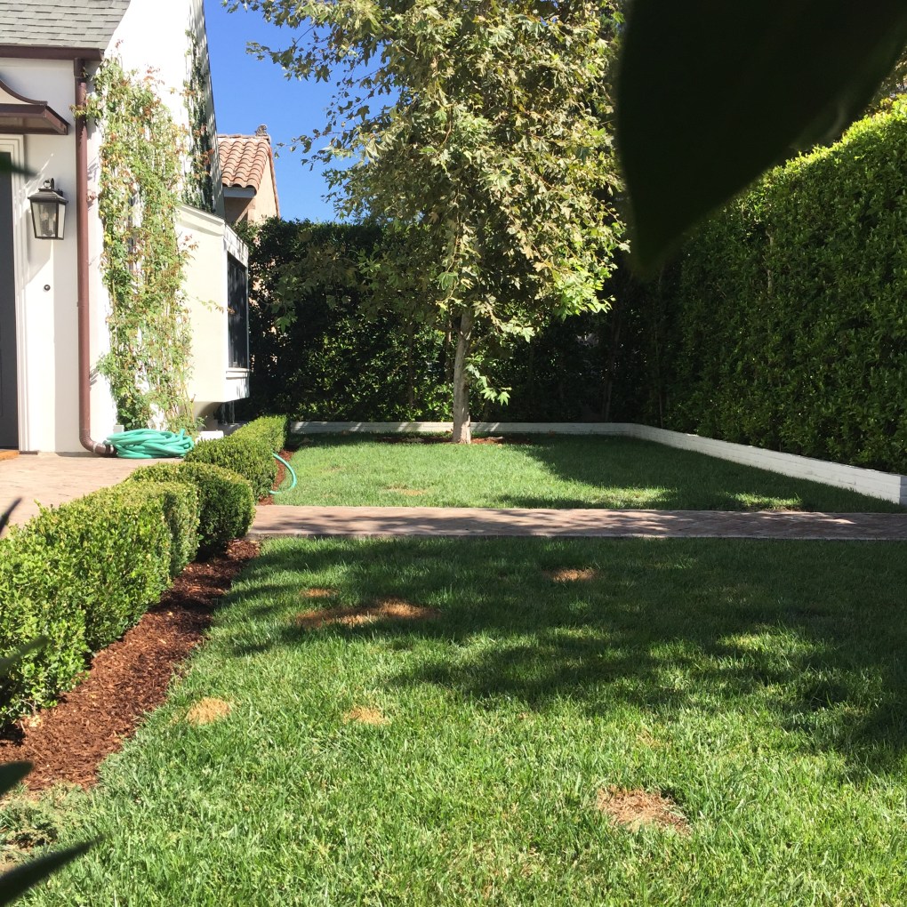 We’re going to start with a clean slate and will be removing all of the existing boxwood, grass, ficus trees, lighting, and wire fence. Then, we’ll level off the soil and get to work.