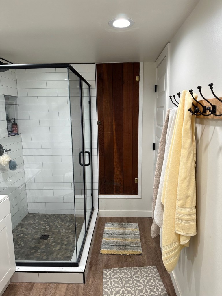 In looking at the three areas to choose from to renovate, the bathroom needs the least amount of work and decor so we’re starting there. To minimize cost, we are electing to keep the existing tile shower, flooring, and layout even though I would love to be able to completely start over to really be able to utilize the space properly. (Maybe we’ll tackle that in the future.)