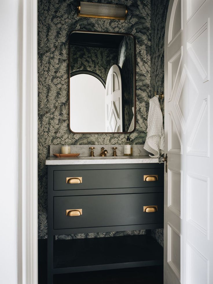 I want the space to feel elevated and timeless while also not seeming out of place in a 1930s cottage. When I saw this bathroom designed by Jean Stoffer above on the left, I knew I had found the perfect inspo. That wallpaper was so striking and so moody and it felt like it had just the right balance of pattern and foliage without feeling too “grandma”.