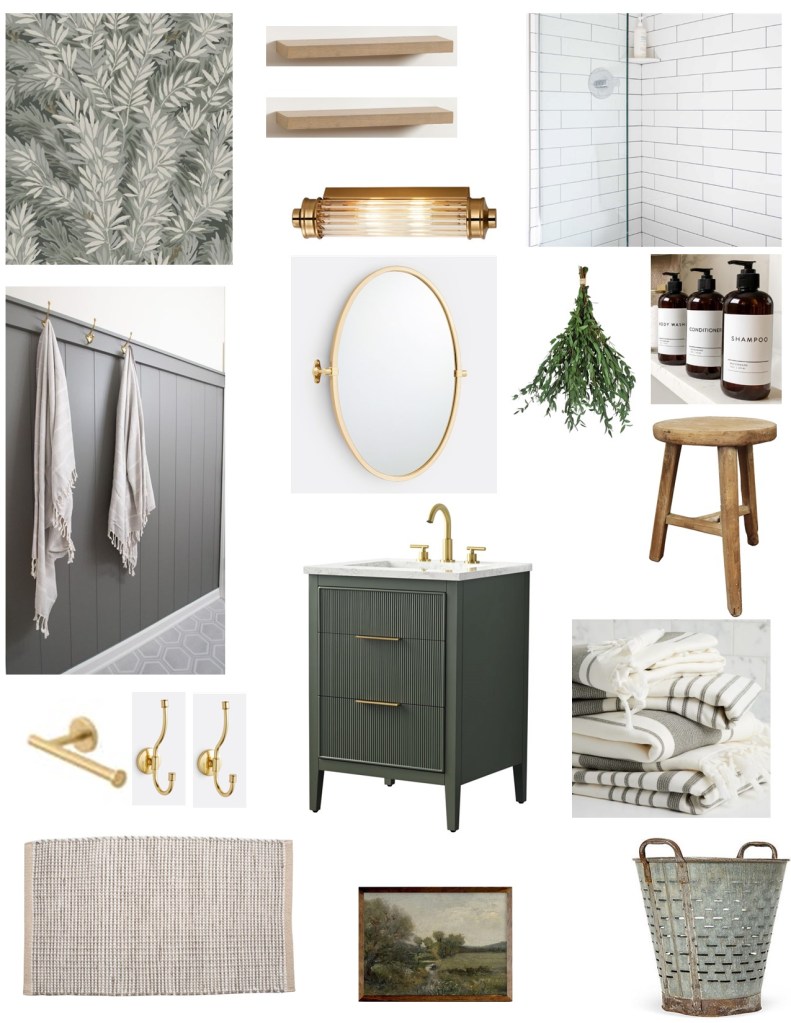 My plan is to make the space feel intentional by adding vertical shiplap along the walls about two-thirds of the way up in a beautiful, dark green that has gray and blue undertones to add some moody drama. Then wallpaper will go above to add a bit of whimsy with a subtle nod to the outdoors. I searched and searched for an affordable pattern I loved as much as the Jean Stoffer one, but I couldn’t get the “Florencecourt” foliage out of my head so I took the leap, splurged a little, and bought the same wallpaper featured in the inspiration photo.