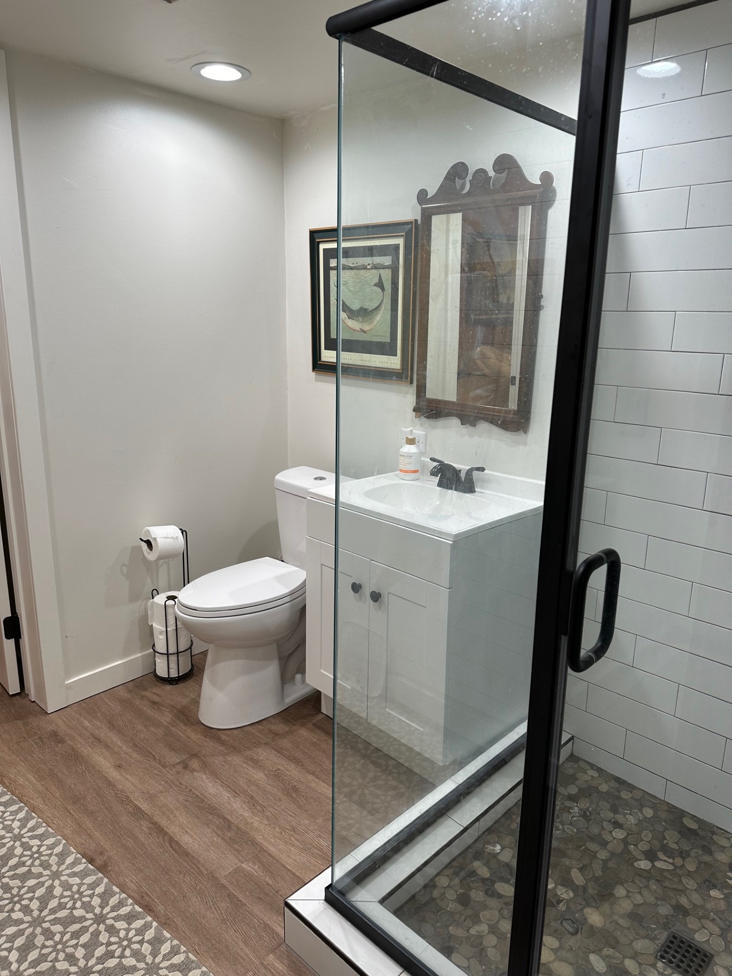 We started with the downstairs guest bathroom since it needed the least amount of demo and work. We wanted to make sure the design felt like it fit naturally with the 1930s cabin, while still keeping the updated shower that it came with when we bought it.