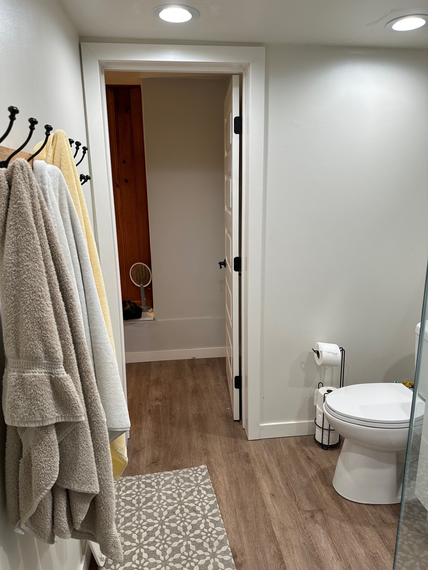 The biggest change to the space was definitely removing the wooden door next to the shower that allowed for access to the water heater. We moved that access to be in the adjacent bedroom so that we could remove the wooden eyesore and better utilize that void for some much needed bathroom storage.