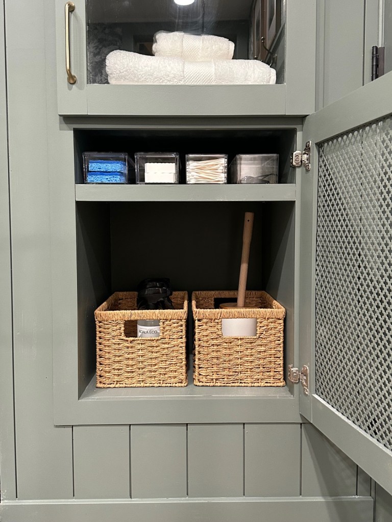 Because there was no place to store towels or linens, we chose to replace the door with a custom built-in cabinet that again, Brian built by hand (standing ovation for those woodworking skills, babe). We added glass on the top portion to keep the linens dust free and a metal grate detail on the bottom to disguise unsightly items like cleaning supplies, a toilet brush, sponges, and backstock. Now we have enough storage for the room and a pretty place to put it all.
