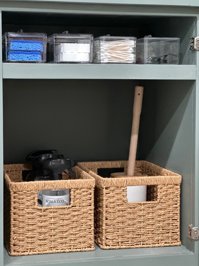 Since we couldn’t do a full remodel on the space, we opted to keep the existing shower, but replaced the builder-grade vanity with one that had a lot more personality and drawers for more storage. The middle drawer now houses all the essentials like cotton balls, Q-tips, and haircare products, while the bottom drawer houses extra toilet paper and trash bags.