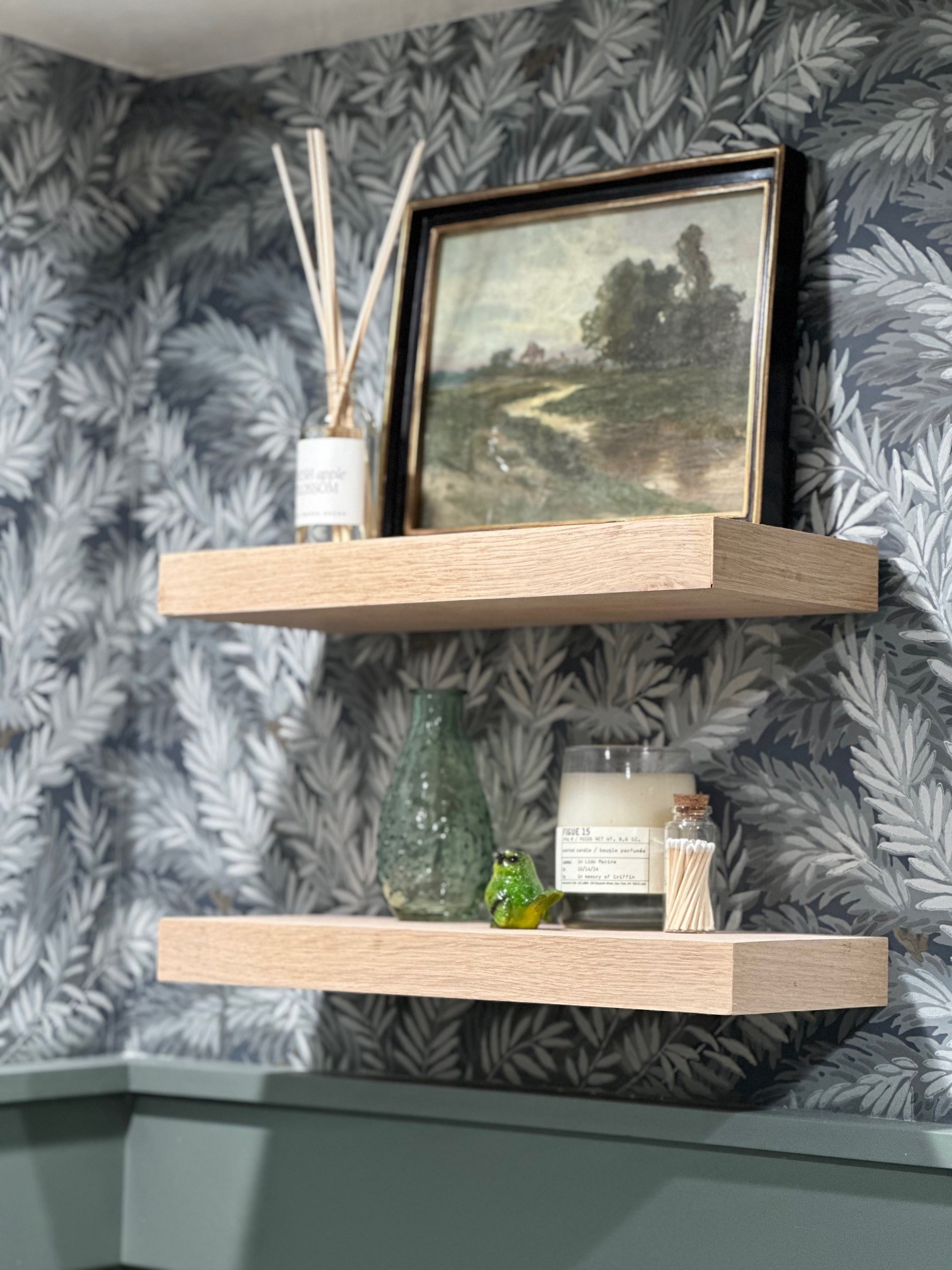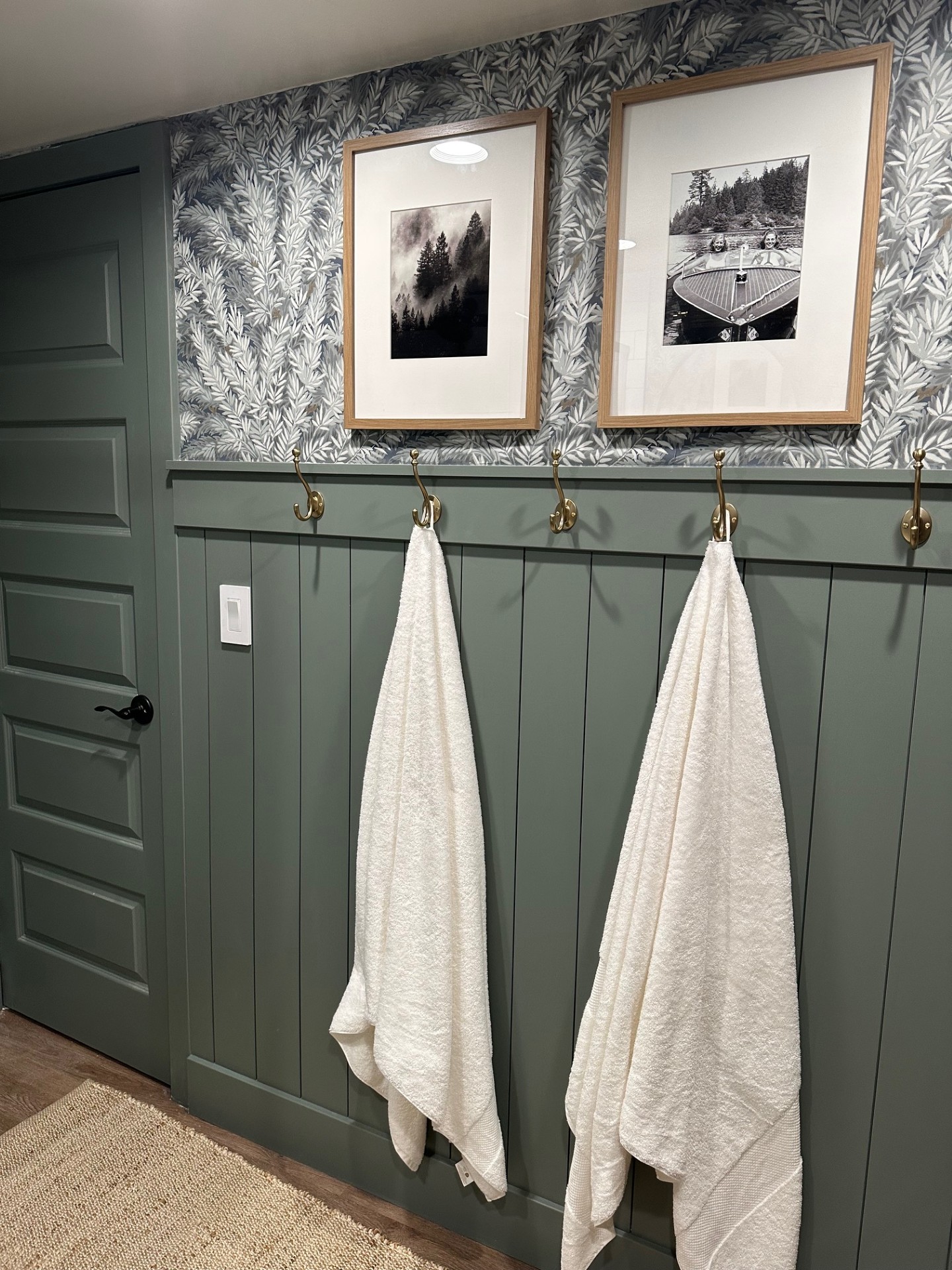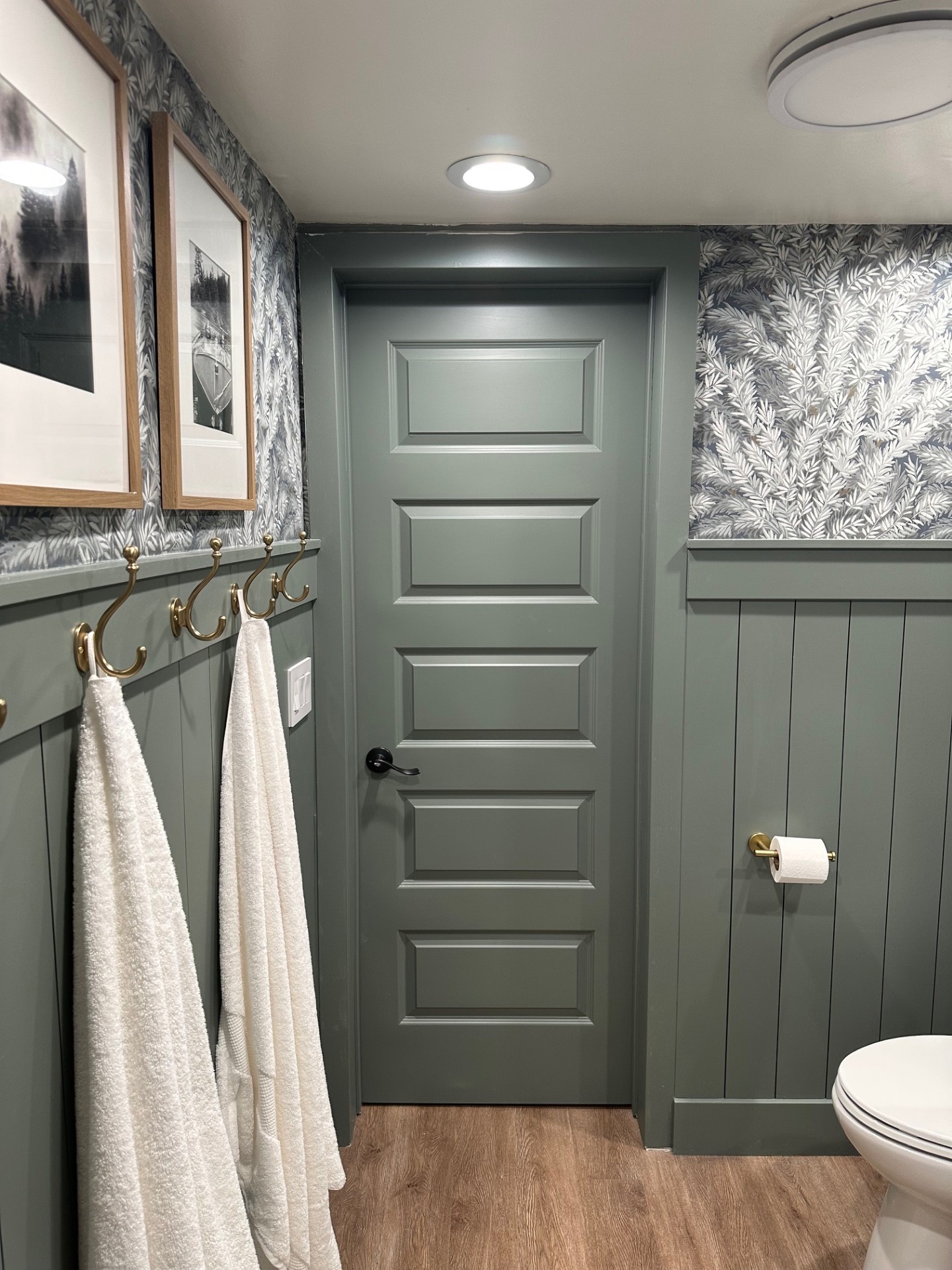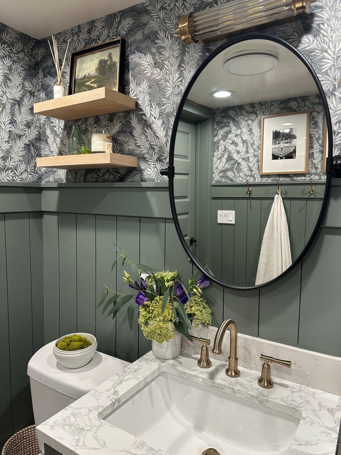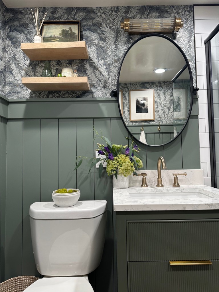 To erase all the underwhelming white that existed, we embraced color and went with Sherwin Williams’ “Retreat”, a sumptuous green that fit in perfectly in our forested surroundings. We drenched the newly shiplap-lined walls, baseboard, and doors in this moody hue. Then we layered in a beautiful patterned wallpaper above to add some whimsy and movement. I love that the pattern is reminiscent of foliage.