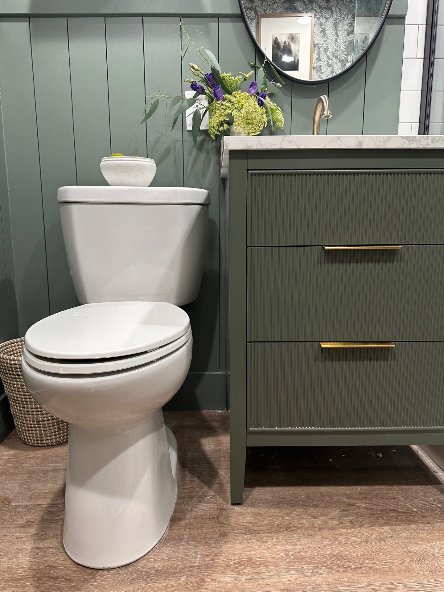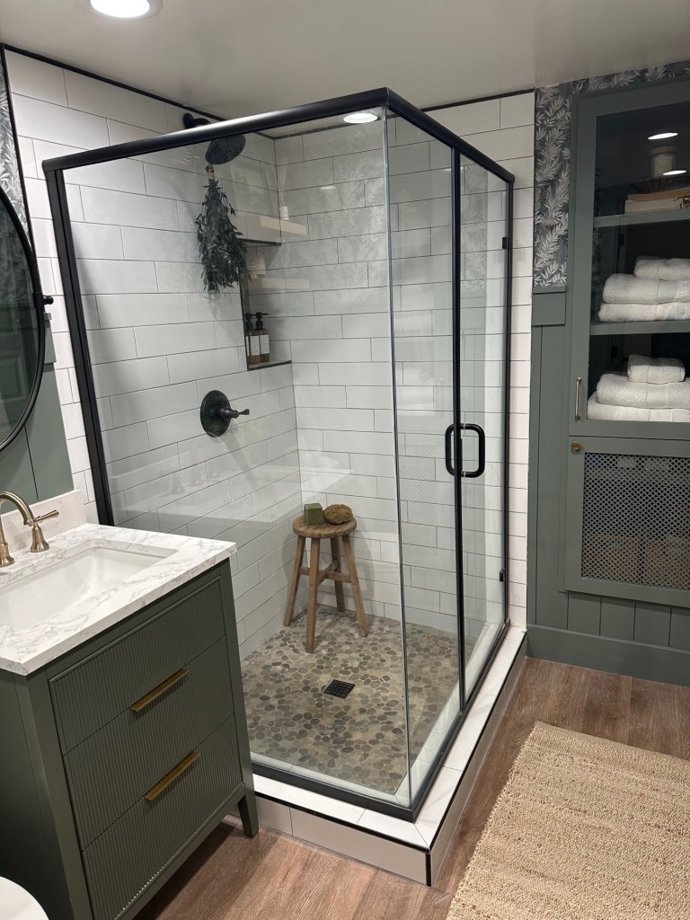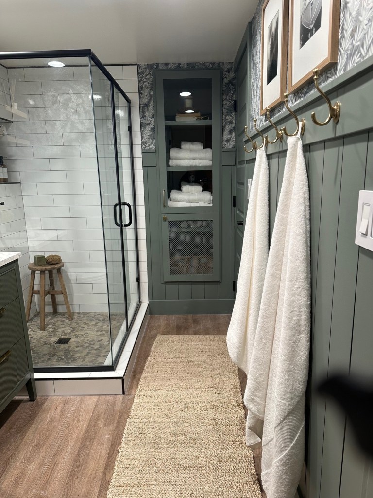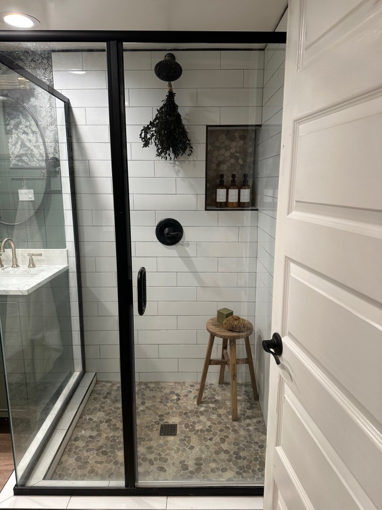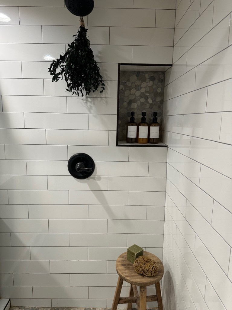 In the shower, we kept things simple, but elevated, by adding in matching product dispensers, dried eucalyptus, and since there was room, a wooden stool I found on Facebook Marketplace. I loved her so much, I wanted to name her and my bestie suggested, “Sitney Spears”. So there you have it. I named a shower stool.