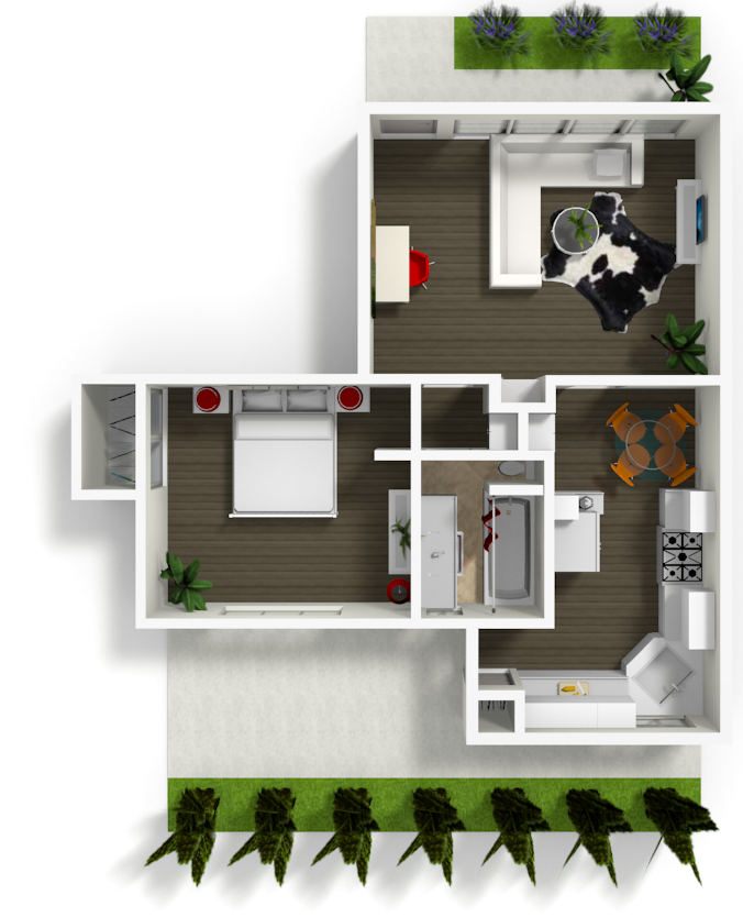 Offering an entire wall of windows in the living room that look out over the center courtyard and a unique built-in bookshelf, the Dietrich floor plan also offers a “loft-like” feel in this layout and the bedroom with the most privacy. You and your guests can flow easily between the living room and kitchen since the hardwood floors run throughout and this is the only floor plan where the two rooms are connected.
