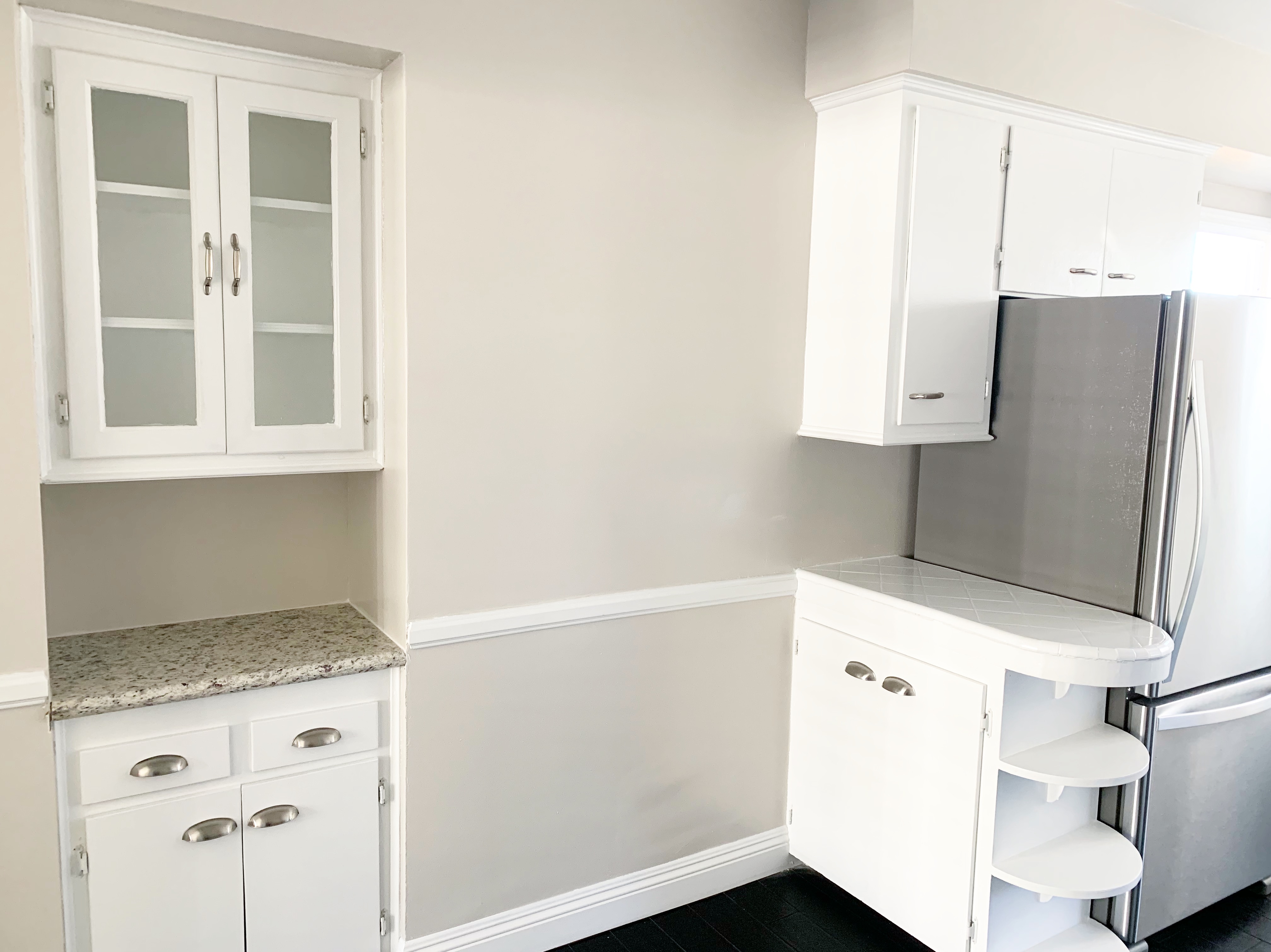 The kitchen, bath, and bedroom windows look out onto the tall trees that line the side of the building for a lush green view from every window. In the kitchen you’ll find a breakfast nook and small bar cabinet with glass doors. A small hallway guides you to both the bath and bedroom and includes a linen closet for added storage. The bedroom in this floor plan is very large and is the only bedroom that is situated on the side of the building – allowing for the most privacy and a quiet retreat.