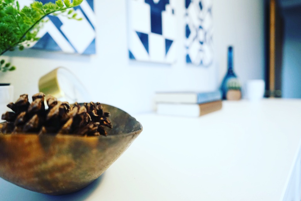 I took note of our surroundings for inspiration which were obviously very earthy and rustic. In winter, the cabin is covered in nothing but an icy white glaze with little pops of wood peeking through the snow from the naked tree limbs. I also thought about what colors were absent in our environment and thought that a dark blue and stark white would be the perfect juxtaposition against the mostly cocoa-colored backdrop of Utah. Then I started a Pinterest board to see how the ideas I had in my head all looked together.