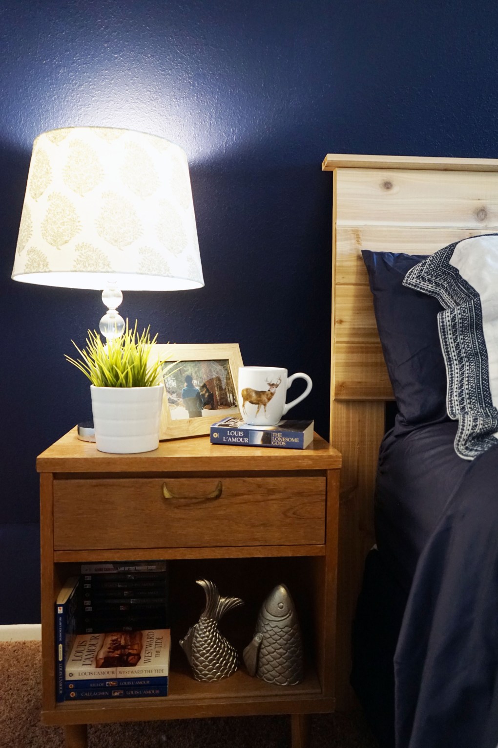 One of the biggest focal points and challenges in the room is the slanted back wall behind our bed. Since it dominates the space already, I decided to embrace and highlight it rather than try to hide it. With this in mind, I made the bold decision to paint the entire wall a deep blue hue for dramatic effect and to contrast with the white bed spread and dresser we picked out.