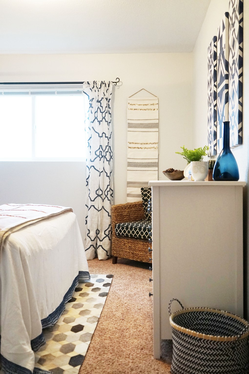 We added a large white dresser for storage that is a better scale for the room and long wall that we placed it on, opposite the bed. Above it, we hung a fun geometric triptych picture and accessorized with woodsy accents and a few of Brian’s favorite cowboy books, natch. A chair in the corner is both functional and pretty and to hide the unsightly electrical panel, we hung a light-colored tapestry over it so that it was hidden but still accessible. Blue and white sheer panels from Pottery Barn helped to frame the small window and soften the lines of the wall.