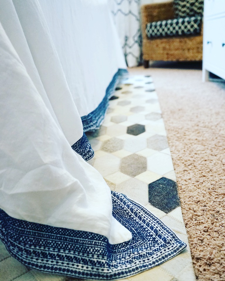 Since Brian is great at woodworking, he made us a rustic headboard by hand that helped to anchor the space, break up the dark wall, and add some texture. Then we layered in a white linen bedspread from Restoration Hardware that has delicate blue stitching along the edges and blue satin sheets that feel like heaven after a long day of ATV riding. We topped the bedding off with a shearling blanket and pillows for added warmth in the winter and to also bring in that “cabin-y” vibe. For another texture touch, we added a geometric cowhide rug underneath the bed to hide some of the wall-to-wall chocolate carpeting too.